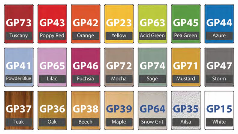 - Choice of 21 table top colours.